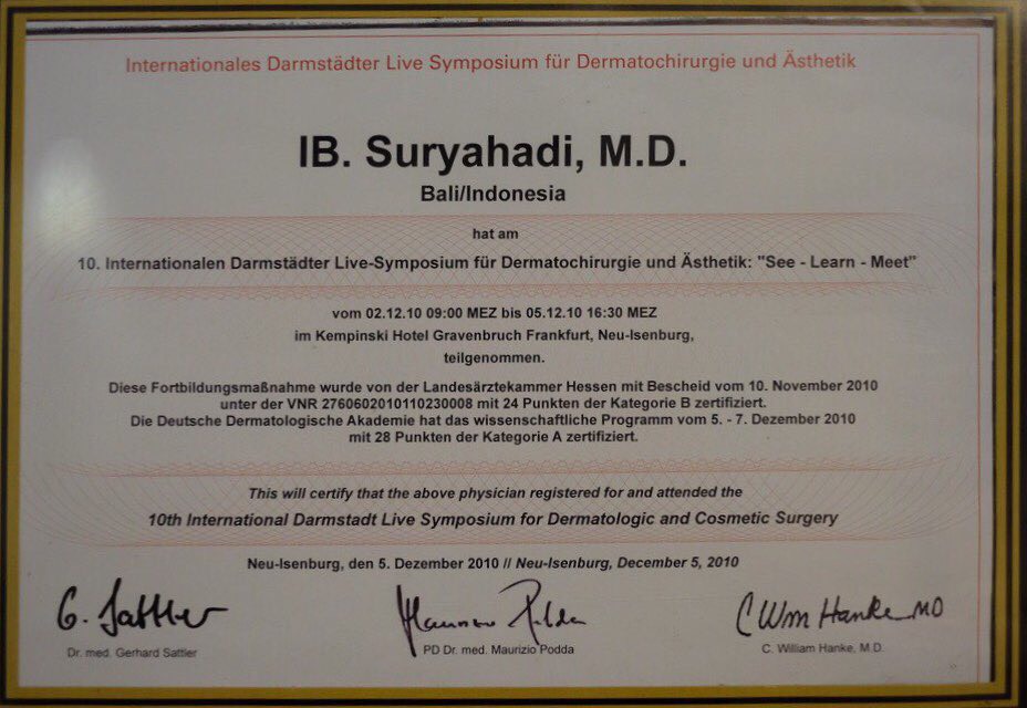 Dr. Surya has over 25 years of extensive experience in the industry, including 10 years at own clinic in Bali. He is frequently sought to deliver training courses to practitioners clinics in Indonesia. Having received his own training by world-renowned leaders in the aesthetics industry. His knowledge of the field is all encompassing. Dr. Surya has made a huge investment in the most advanced medical grade technology and products such as rhinoplasty in Stuttgart, breast in Wiesbaden and face in Frankfurt. These investments enable him to deliver to the highest quality Aesthetic procedures that are ethically driven in a flourishing industry. Dr. Surya is an expert in his field, and is certified in Advanced face, rhinoplasty and breast. He is committed to continual personal and professional development, and is currently owning clinic.